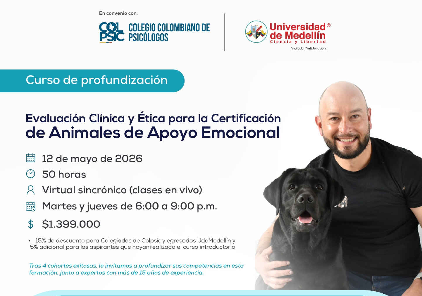 Si eres colegiado de Colpsic o empleado de la Universidad de Medellín, accede a un 15% de descuento. Además, los aspirantes que hayan realizado el curso introductorio recibirán un 5% adicional.